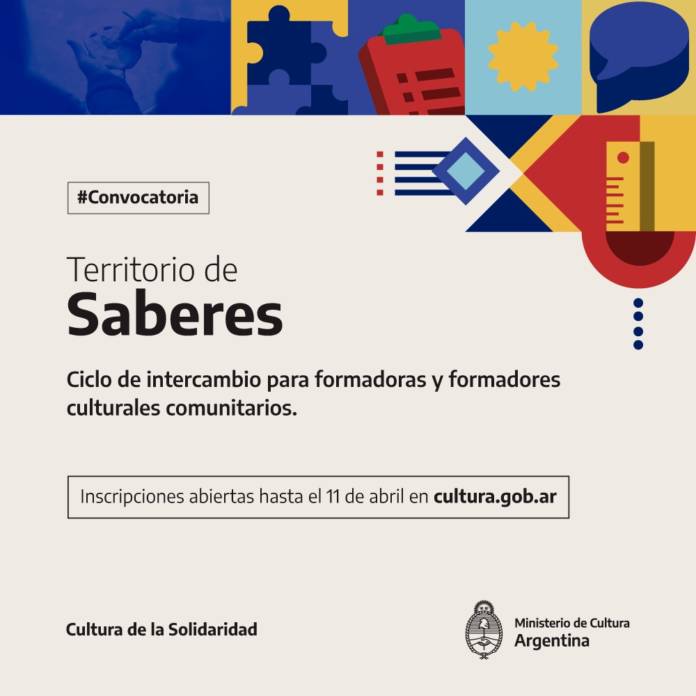 El Ministerio de Cultura de la Nación, a través de la Dirección Nacional de Formación Cultural de la Secretaría de Gestión Cultural, abrió la inscripción para “Territorio de Saberes”, el ciclo federal de formación a distancia para intercambiar saberes sobre temáticas estratégicas para la cultura comunitaria. Los encuentros tratarán temáticas como igualdad de género, soberanía alimentaria, derechos de las comunidades indígenas, cooperativismo, educación popular y cultura comunitaria, entre otras.