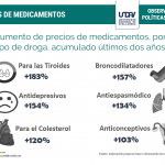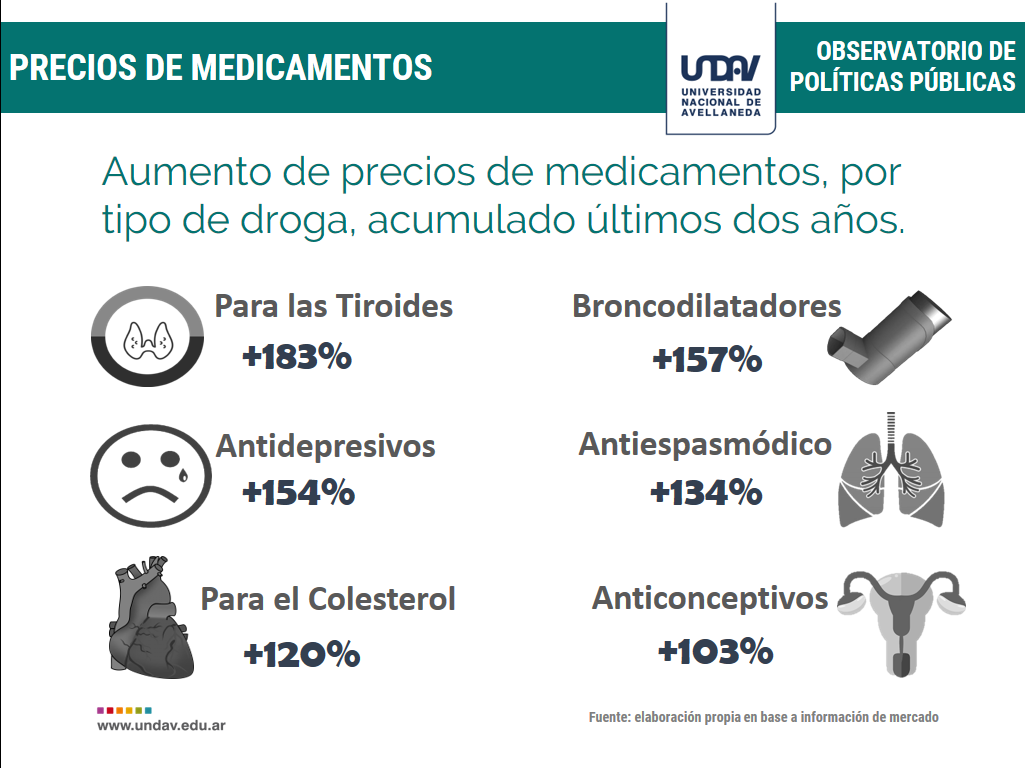 En el detalle, se destacan las subas más pronunciadas en medicamentos para las tiroides (+183%), broncodilatadores (+157%), antidepresivos (154%) y antiespasmódicos (134%), entre otros.
