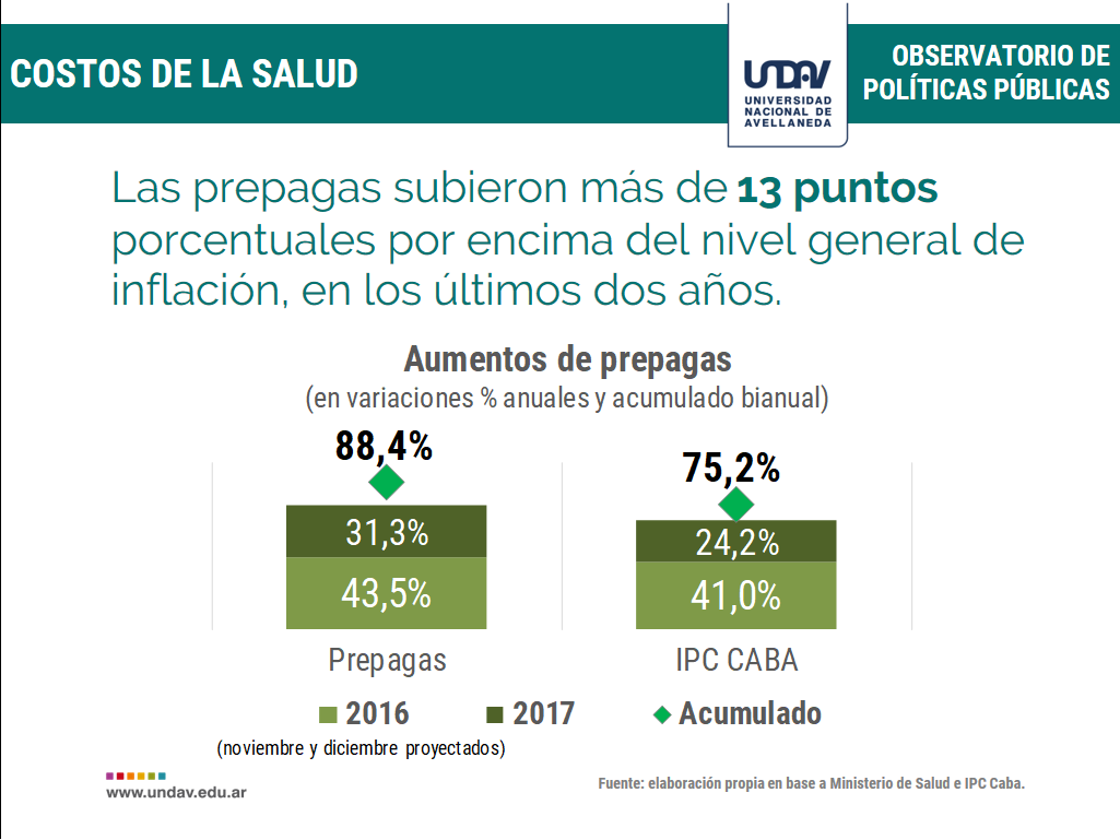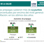 Otro impacto relevante sobre el gasto familiar en salud, se vincula con los aumentos en prepagas. A pesar de que las empresas se enfrentan a una menor demanda, buscaron compensar vía precios la merma de ingresos. Así, en el acumulado de los dos últimos años, el aumento en la cuota fue del 88,4%, esto es, 13 puntos porcentuales por sobre la inflación.