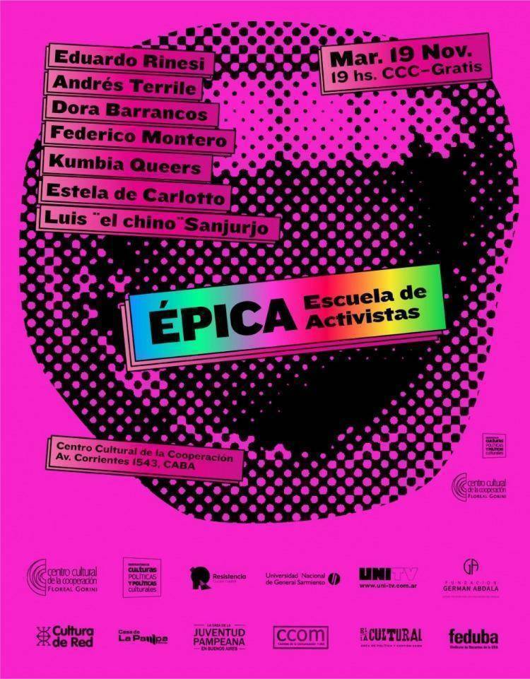El Centro Cultural de la Cooperación llevará a cabo la tercera edición de Epica, escuela de activistas. La iniciativa nace como un dispositivo que trata de mapear como el deseo y la necesidad se ha transformado en expresión y lucha colectiva y pública en los últimos años. Lo hace pensando en el futuro de esos deseos, necesidades y expresiones con una pertenencia a las reivindicaciones que ha marcado la historia argentina.