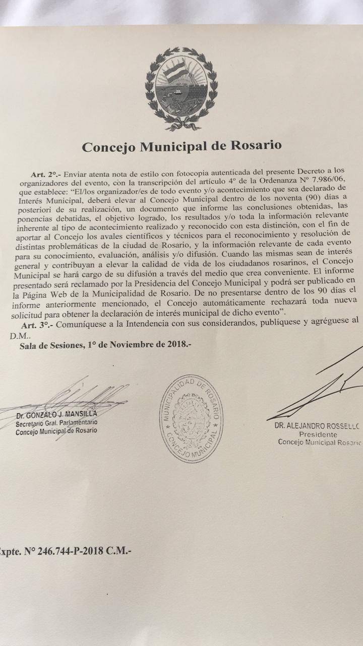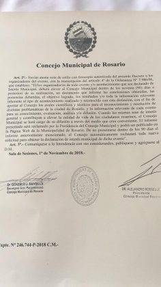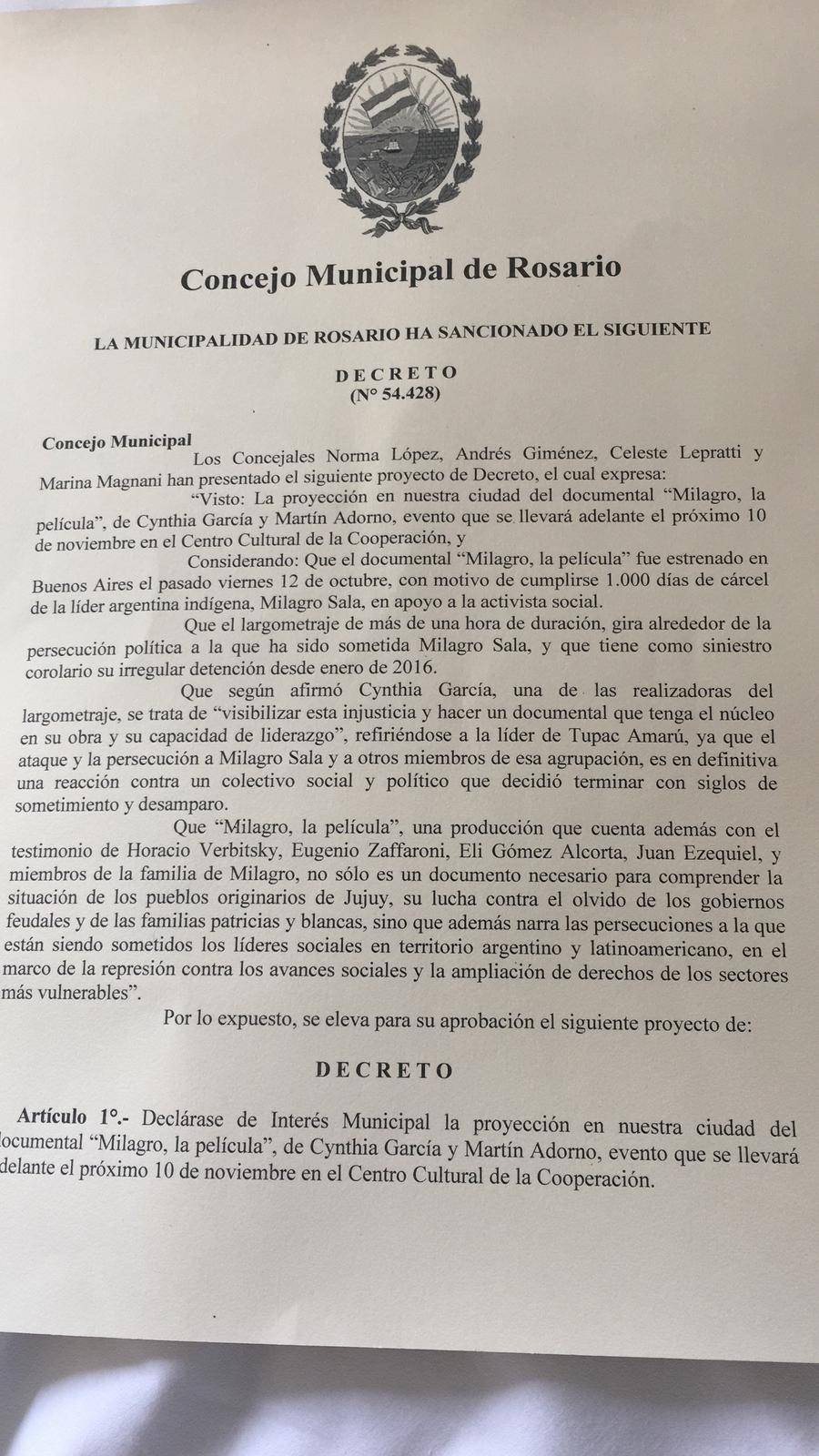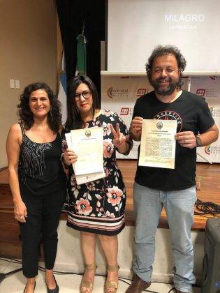 En el marco de la gira nacional de presentación de «Milagro, la película», el Concejo Municipal declaró al largometraje «de interés municipal la proyección del documental de Cynthia García y Martín Adorno». El film se emitió este sábado 10 de noviembre en el Centro Cultural de la Cooperación de la ciudad santafesina ante una sala repleta.