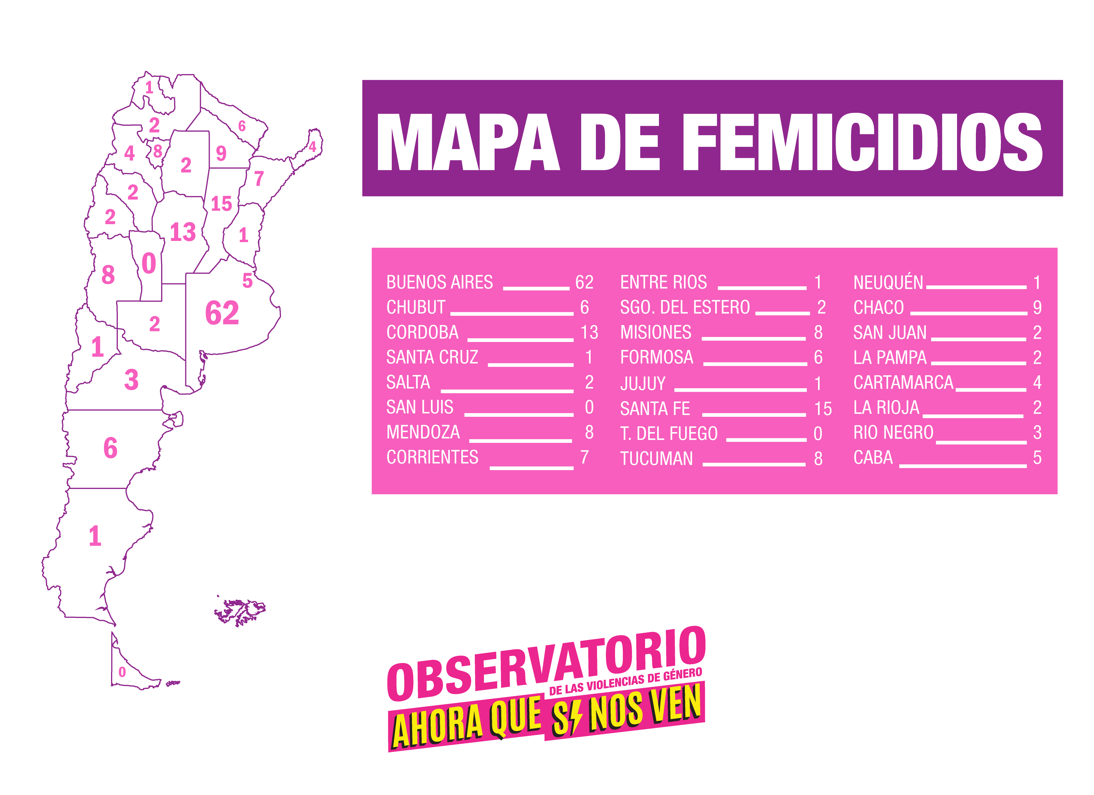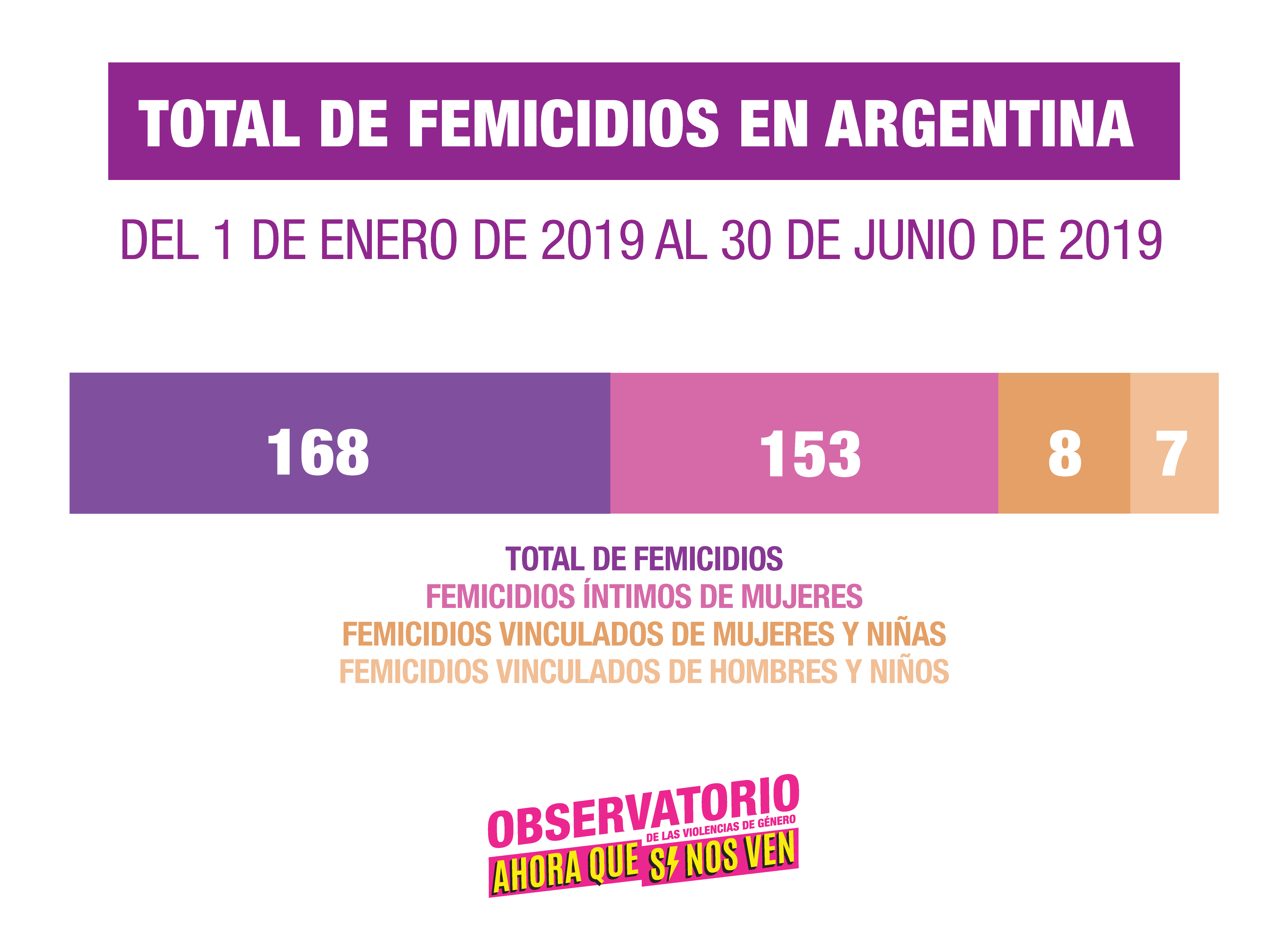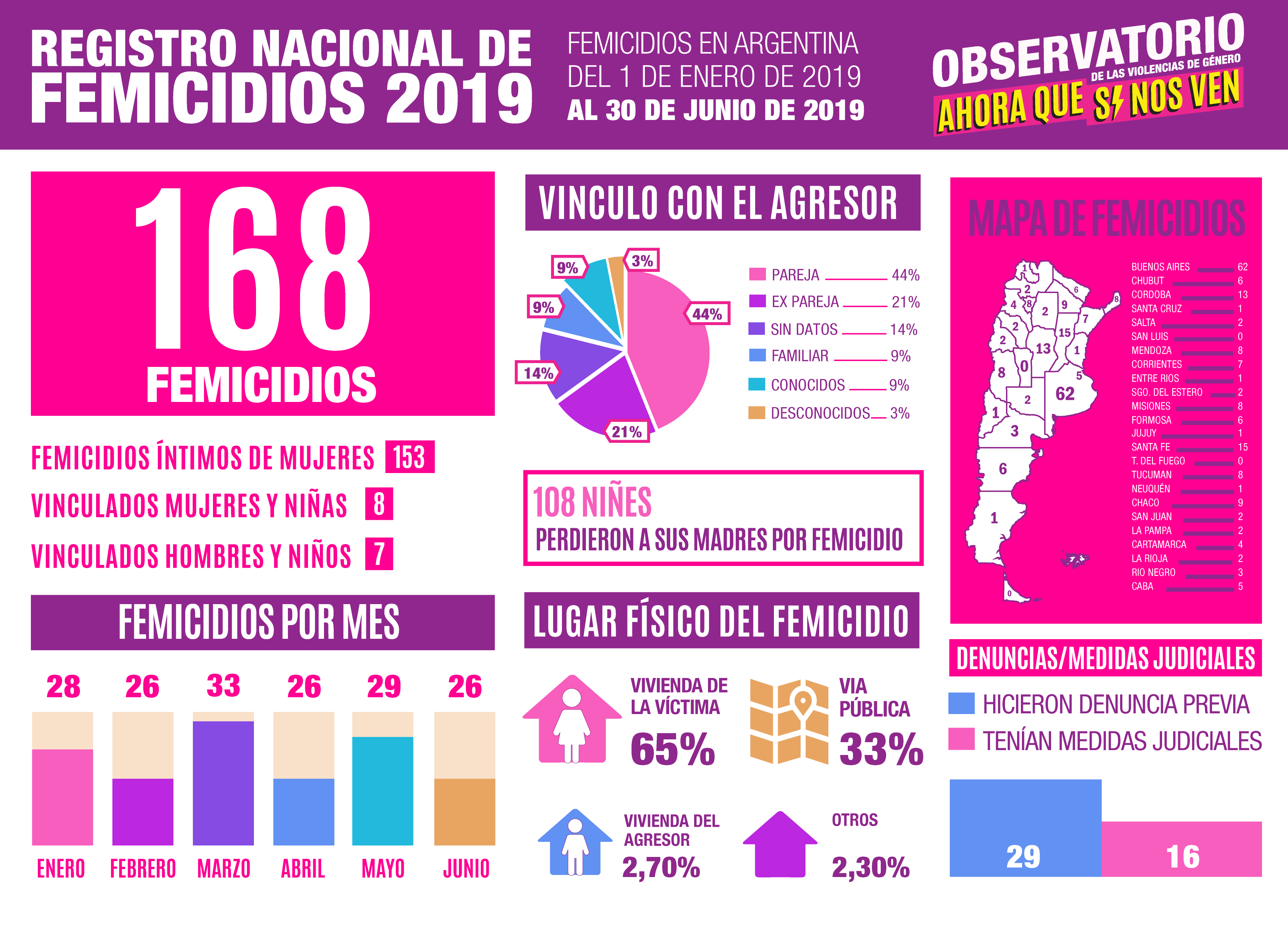 En junio se registró un femicidio cada 27 horas lo que asciende a 26 en todo el mes. Así lo indicó un informe del Observatorio de las Violencias de Género «AHORA QUE SÍ NOS VEN» que estudió los casos ocurridos entre el 1 de enero y el 30 de junio de este año. En los primeros seis meses del 2019, se registraron 168 femicidios, dentro de los cuales 153 fueron femicidios íntimos de mujeres, 8 fueron femicidios vinculados de mujeres y niñas y 7 vinculados de varones y niños. Al menos 108 niñxs quedaron huérfanos a causa de la violencia machista.
