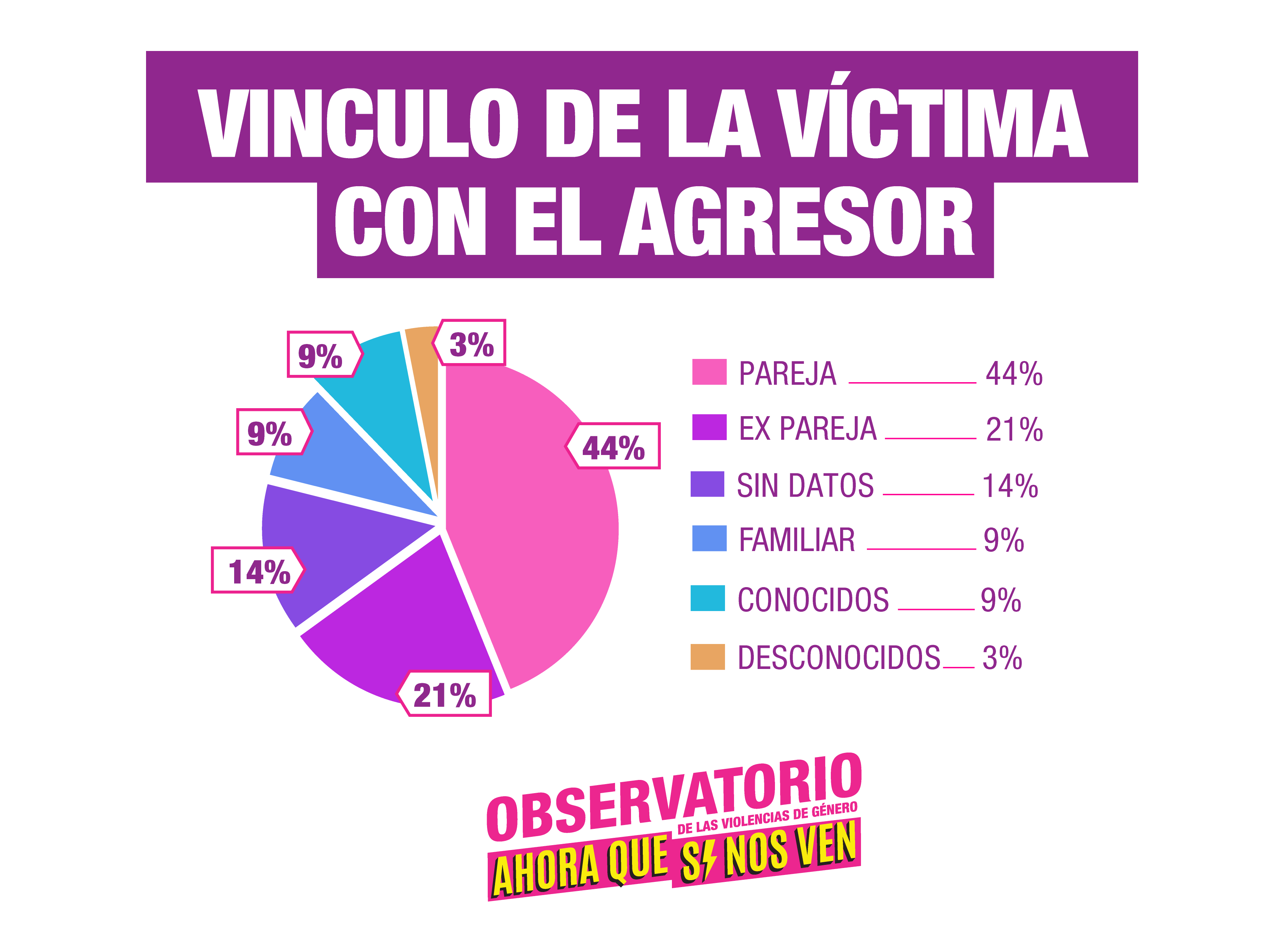 Según el estudio, el 44% de las víctimas fueron asesinadas por su pareja, el 21% por su ex pareja, el 9% por un familiar, el 9% conocidos y 3% por personas desconocidas. No se tienen datos del 14% restante. El Registro Nacional de Femicidios se realiza en base al relevamiento de los medios gráficos y digitales de todo el país.