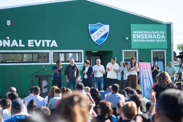 Este martes 30 de septiembre en un acto encabezado por el intendente Mario Secco y el gobernador de la Provincia, Axel Kicillof, se llevó adelante la inauguración del Complejo Deportivo y Salón de Usos Múltiples del Club Nacional Evita. Esta obra, ubicada en 19 y 6 (Punta Lara), cuenta con un amplio SUM que incluye baños, oficina, cocina y depósito. Además, el Municipio construyó una cancha de fútbol 11, un playón deportivo y se equipó la plaza Eva Perón con mesas, bancos, juegos y pérgola, en conjunto con trabajos de forestación y colocación de luminaria LED.