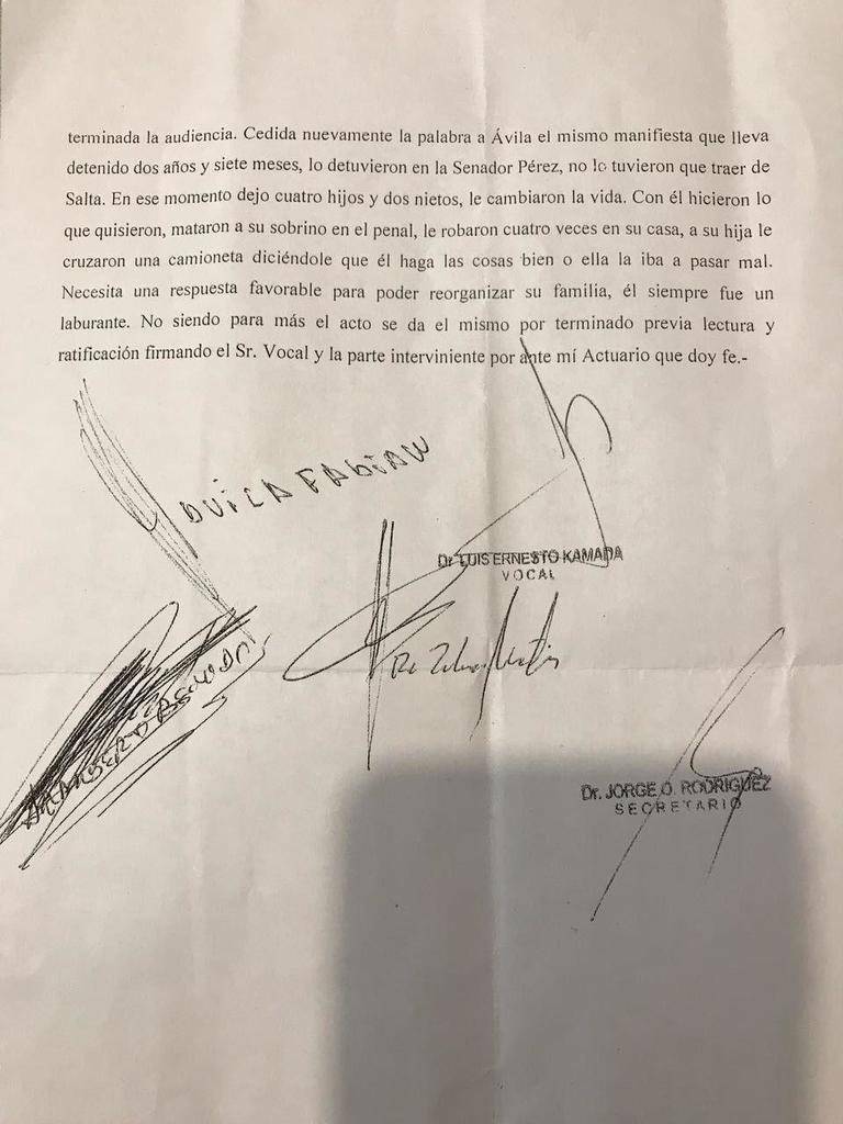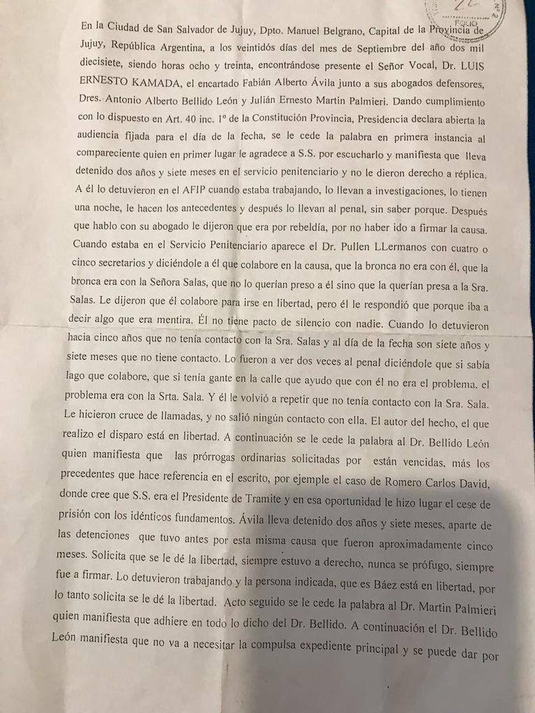 En la declaración realizada el 22 de septiembre de este año, en el marco de la presentación del habeas corpus, Fabián Ávila señaló que cuando se encontraba en el Servicio Penitenciario apareció el doctor Pullen Llermanos y le dijo que colabore en la causa, que la bronca no era con él, que no lo querían preso a él sino a la señora Sala. “Le dijeron que colabore para irse en libertad, pero él respondió que por qué iba a decir algo que era mentira”. Y añadió que “lo fueron a ver dos veces al penal diciéndole que si sabía algo que colabore, que si tenía gente en la calle que ayudó, que con él no era el problema, que el problema era con la Sra. Sala. Y él volvió a repetir que no tenía contacto con la Sra. Sala”. Por otra parte, le había manifestado al juez que él “no tenía pacto de silencio con nadie”. Cuando lo detuvieron, expresó, hacía cinco años que no tenía contacto con Sala y al día de hacer la declaración ya eran siete años sin relación con la dirigente