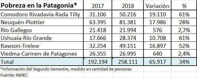 Durante el segundo semestre de 2017, en la región patagónica había 192.194 personas bajo la línea de pobreza. Un año después, el Indec registró 258.111 personas en estas condiciones. Es decir un incremento del 34 por ciento (65.917 personas más).