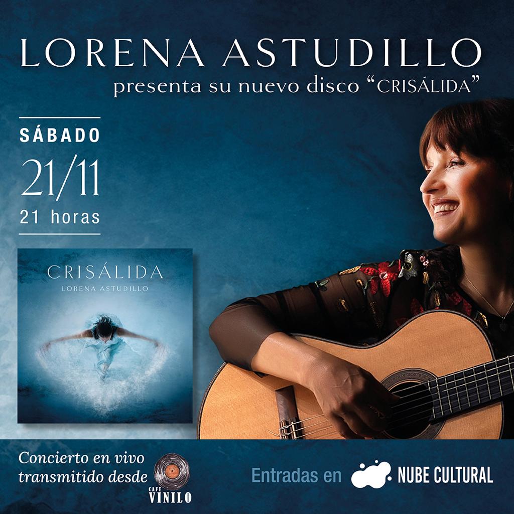 La presentación oficial de Crisálida será el sábado 21 de noviembre con un concierto en vivo, mágico e intimista, con gran calidad de audio e imagen, sin riesgos de corte de transmisión desde Café Vinilo a través de la plataforma Nube Cultural. Participará la banda que acompañó a Lorena en la grabación del disco: Constanza Meinero (piano, arreglos, coros, dirección y producción musical), Sebastián Castro (guitarra y coros), Lucas Homer (contrabajo, bajo eléctrico y coros) y Gaspar Tytelman (percusión y coros). La voz, la composición y la producción musical, artística y general es de Astudillo.