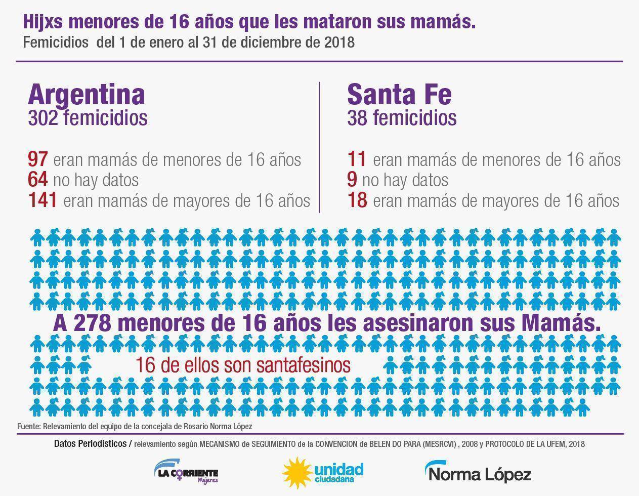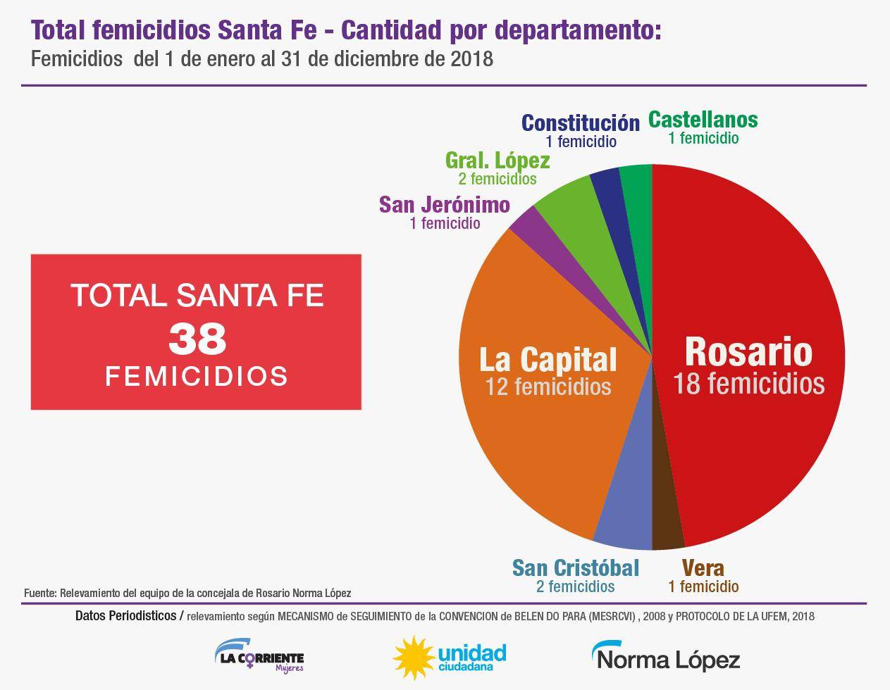 Santa Fe es la segunda provincia con más femicidios del país, detrás de Buenos Aires. Durante el 2018 se registraron 38 femicidios en todo el territorio, de los cuales 18 ocurrieron en Rosario. En un total de 302 femicidios en todo el país, en Buenos Aires se produjeron 107 asesinatos por violencia machista, seguido por Santa Fe con 38 y Tucumán y Córdoba con 21.