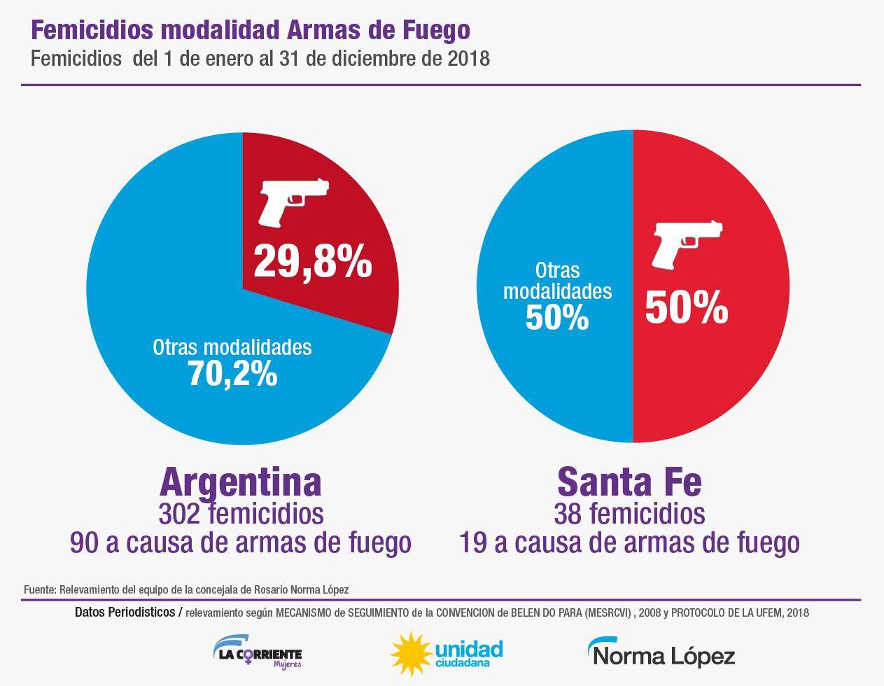 En el informe elaborado por el Equipo de Género de la Corriente Nacional de la Militancia se sostiene que la mitad de las muertes fueron con armas de fuego. “Nuestra provincia supera la media nacional en este sentido ya que en Argentina, de los 302 casos relevados, 90 mujeres (29,80%) fueron asesinadas con armas de fuego mientras que en Santa Fe fueron 19 (50%) de 38”, explicó la concelaja de Rosario Norma López, coordinadora del equipo.