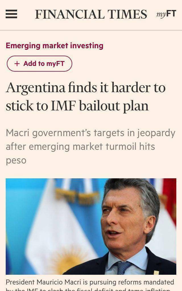 El diario económico inglés Financial Times publicó ayer una nota titulada “Argentina encuentra más difícil mantenerse en el plan de rescate de FMI” en la que da cuenta del sombrío panorama del gobierno de Cambiemos y advierte que “será difícil cumplir con las metas del Fondo Monetario Internacional”